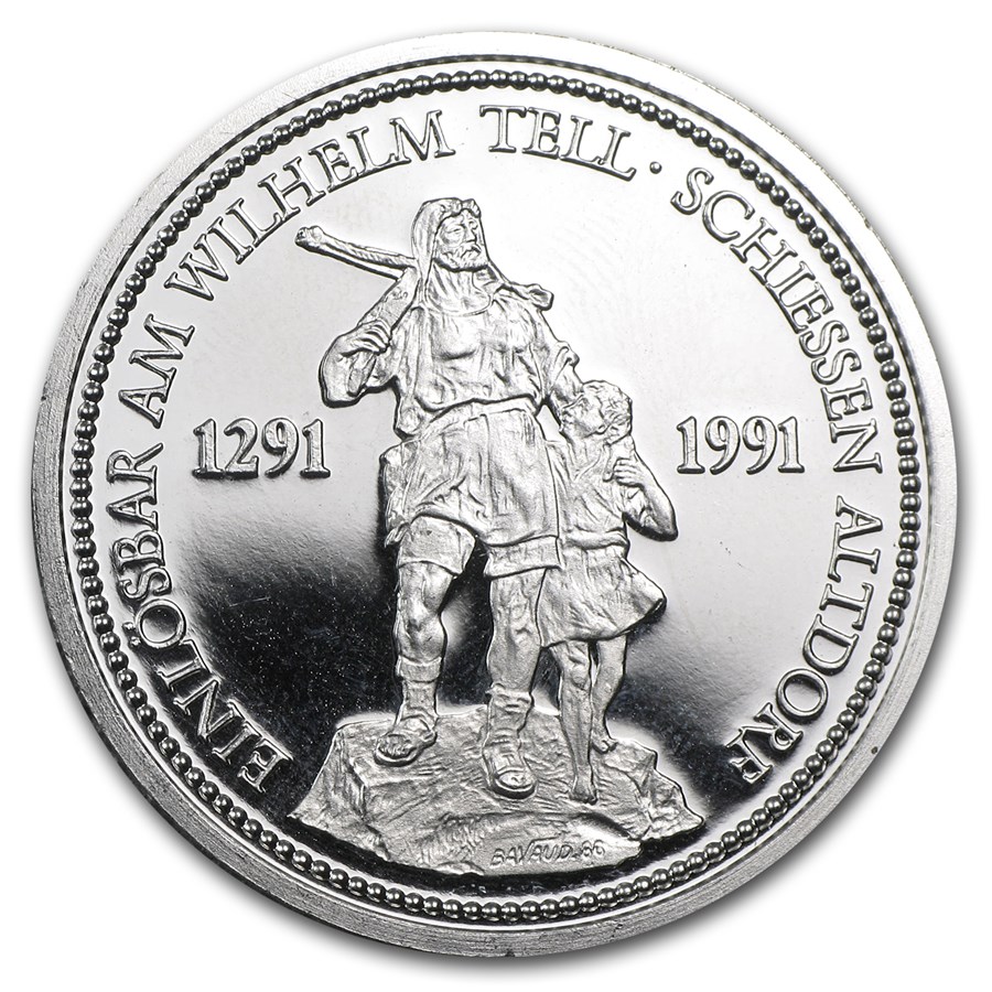 - Obverse: Legendary figure of William Tell holding a crossbow with his son at his side surrounded by “Einlösbar am Wilhelm Tell – Schiessen Altdorf (Redeemable at William Tell Shooting Altdorf).
