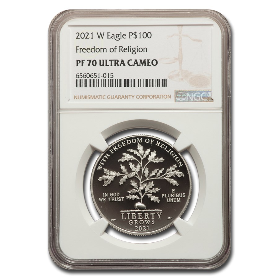 The first coin in the five-year program is the 2021 First Amendment to the United States Constitution Platinum Proof coin – Freedom of Religion.