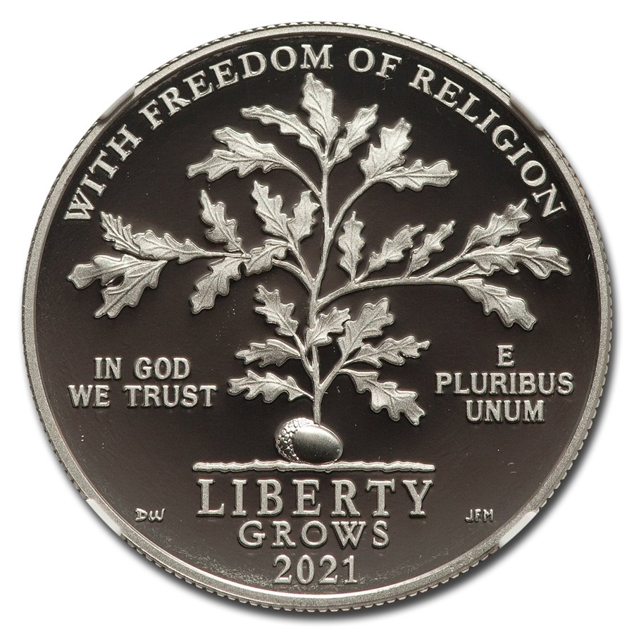 - Obverse: Depicts a seedling and an acorn surrounded by the inscription “WITH FREEDOM OF RELIGION LIBERTY GROWS.” Additional inscriptions are “IN GOD WE TRUST,” “E PLURIBUS UNUM” and “2021.”