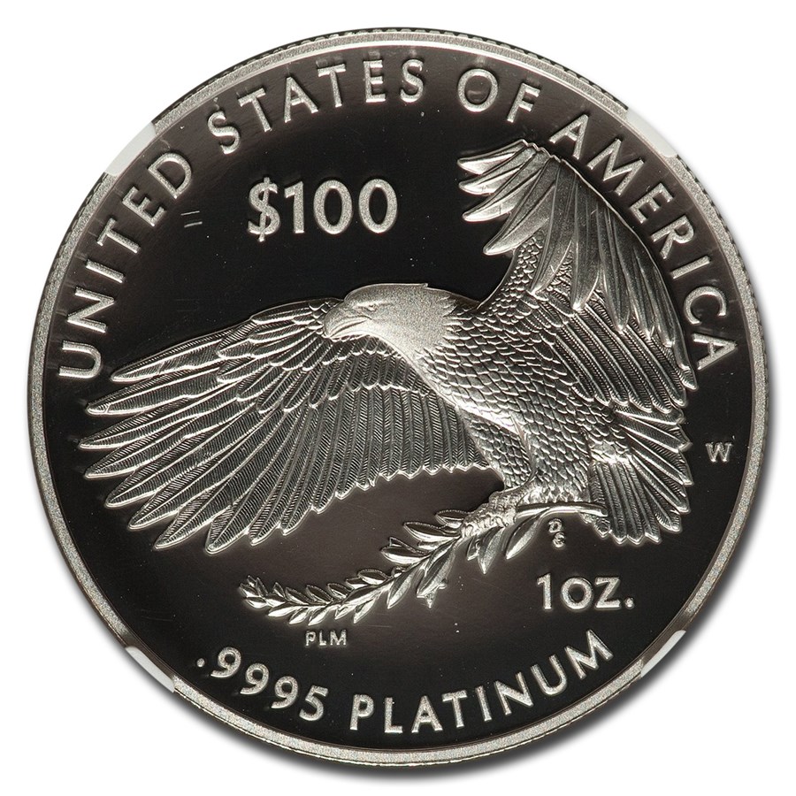 - Reverse: Depicts an eagle in flight with an olive branch in its talons. Inscriptions are “UNITED STATES OF AMERICA,” “$100,” “1 OZ.” and “.9995 PLATINUM.”