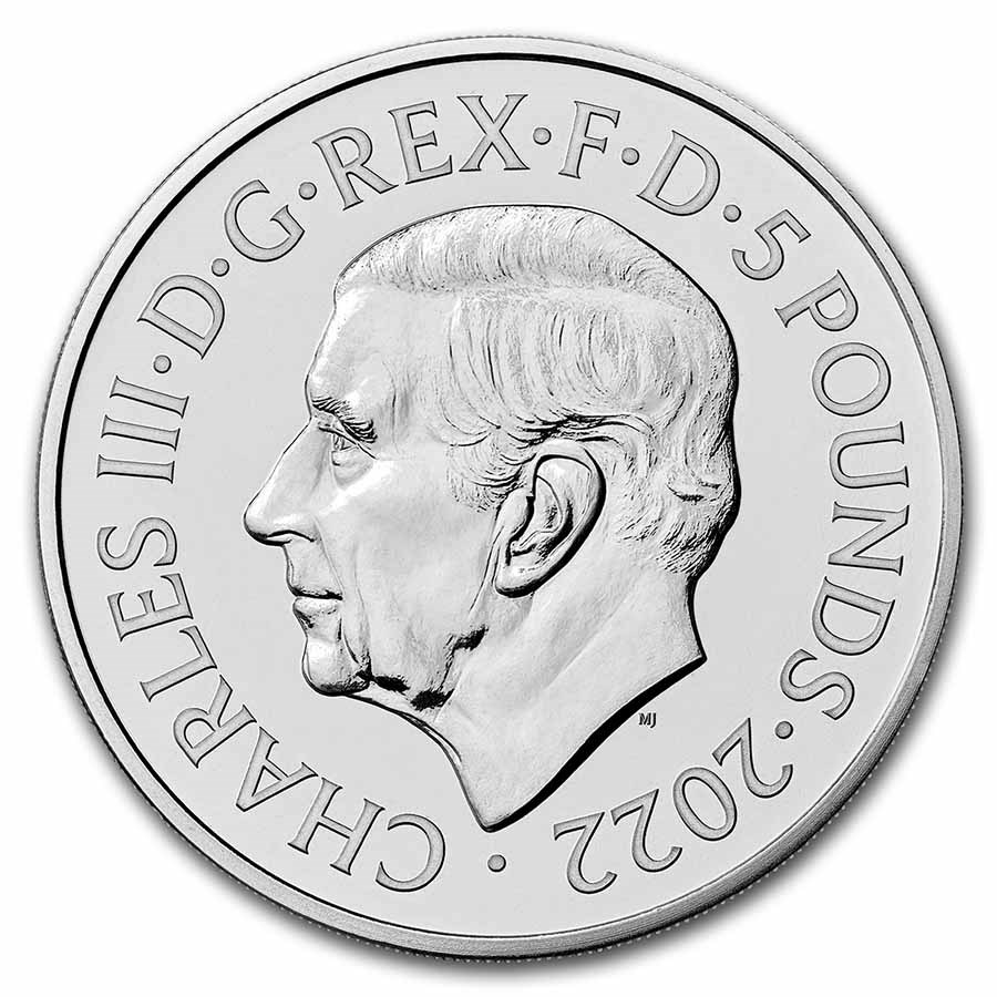 The 2022 £5 Platinum Piedfort release from The Royal Mint pays tribute to Her Majesty Queen Elizabeth II’s incredible life and legacy. This coin is part of a collection of the first coins to feature the official coinage portrait of His Majesty The King.