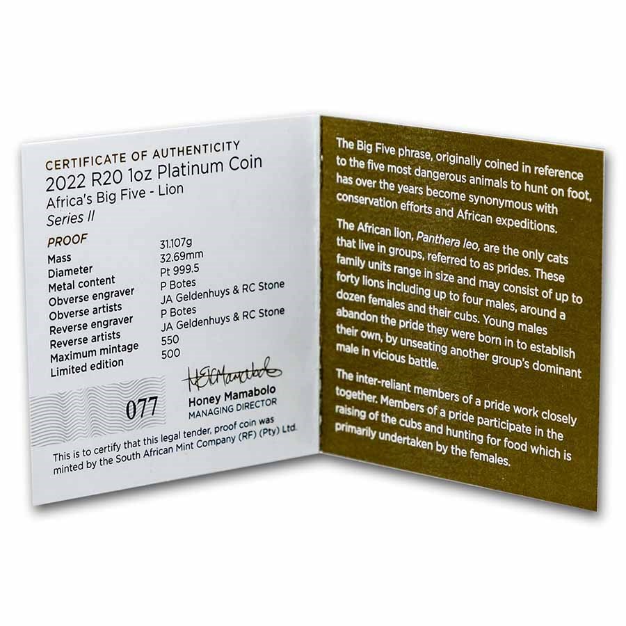 - Obverse: Features a close-up of the lion’s face. The words “South Africa” and “Big Five 2022,” as well as the coat of arms is included.