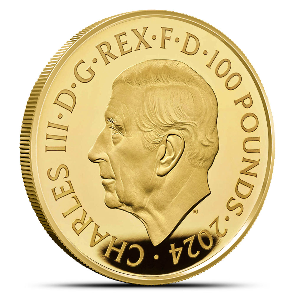 The obverse side of 2024 Proof British Gold Year of the Dragon Coins comes with a vision of King Charles III. This is the first-generation effigy during his reign and was introduced in 2023. Created by Martin Jennings in 2022, the image shows His Majesty in left-profile relief without a crown on his head.